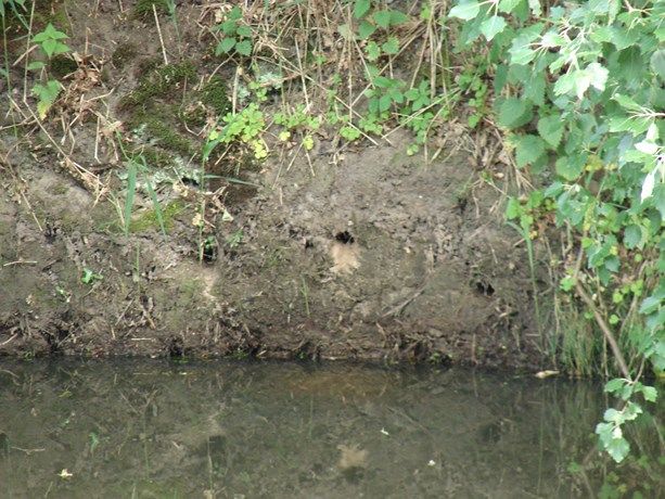 De sterk, schuin, uitgesleten nesttunnel door het in- en uitgaan van de ijsvogels.