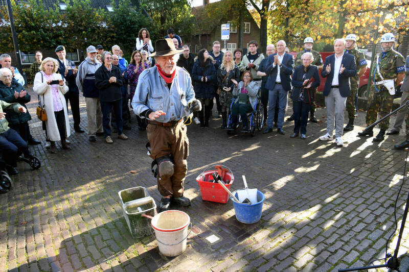 Foto onder: Duitse kunstenaar Gunter Demnig die steen heeft gelegd.
