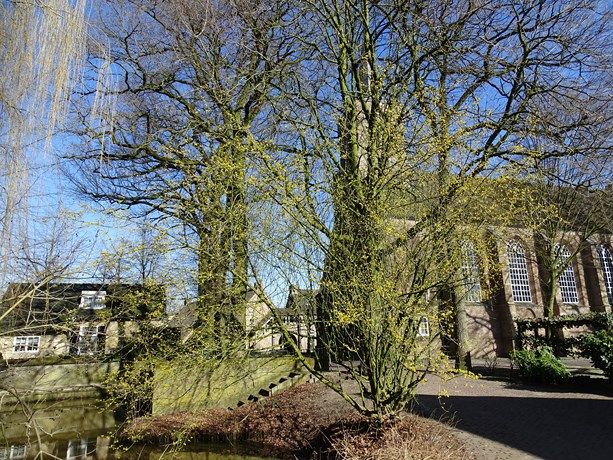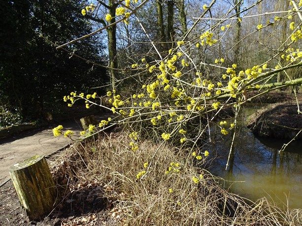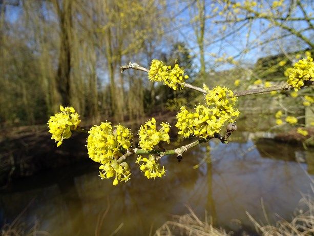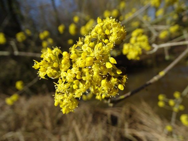 Nabij de hervormde kerk, bij de ingang van het kerkebos, staat een gele kornoelje in bloei. De gele kornoelje komt voornamelijk voor in de natuur in bossen in Limburg en de Ardennen en in de rest van Europa.