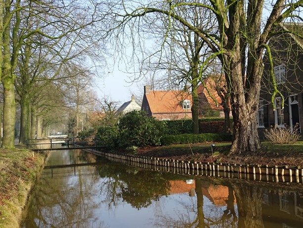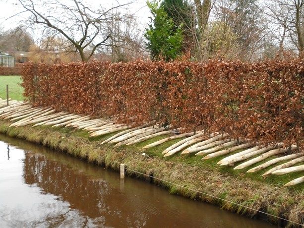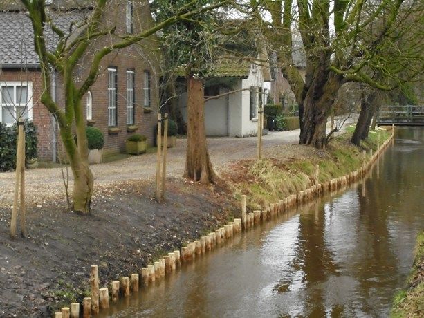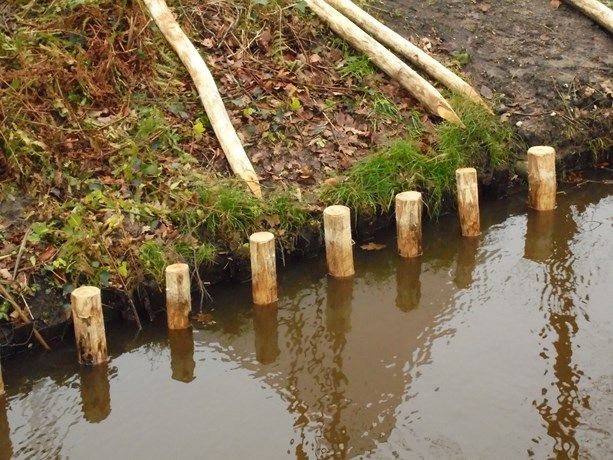 Foto onder: De beschoeiing langs de Vaart met de aansluiting op de Lei. Het is een natuurvriendelijk beschoeiing van onbewerkte palen.