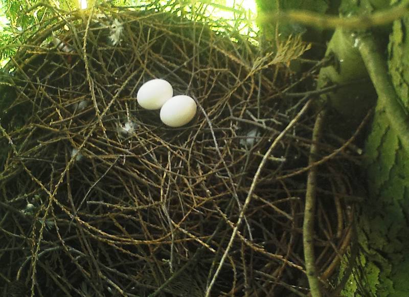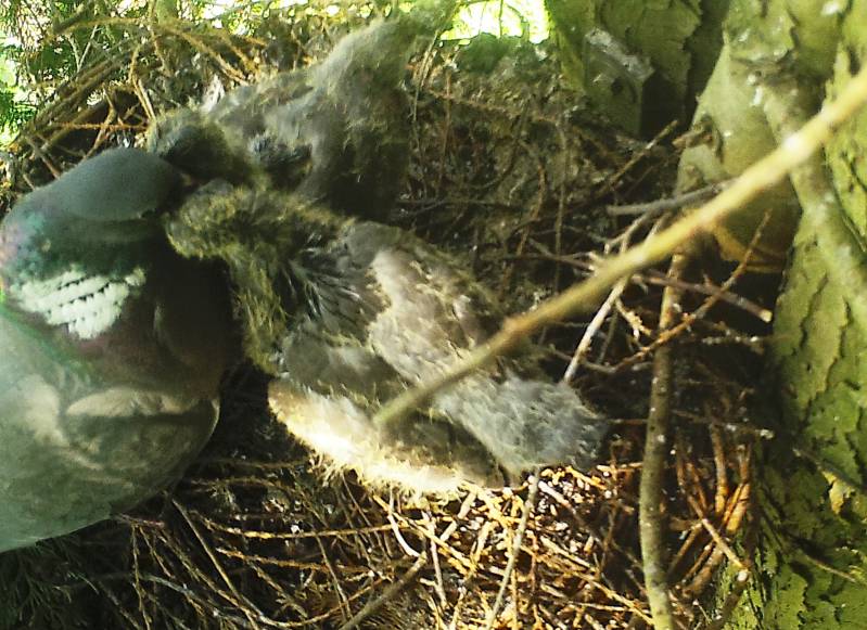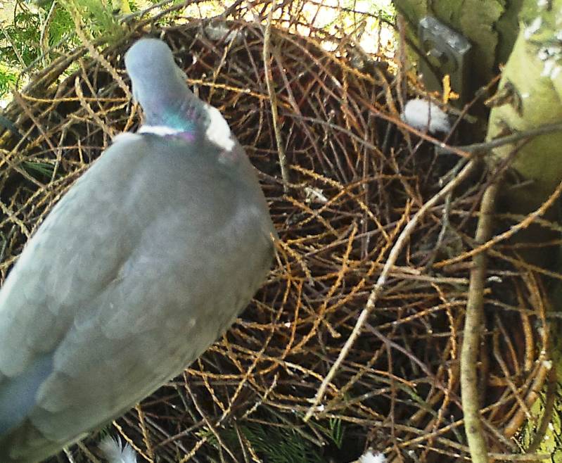 Foto onder : De houtduiven zijn dagelijks op het nest te zien.