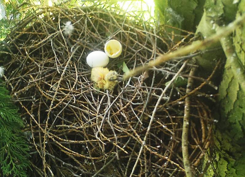 Foto onder: Een jonge houtduif is net uit het ei gekomen.