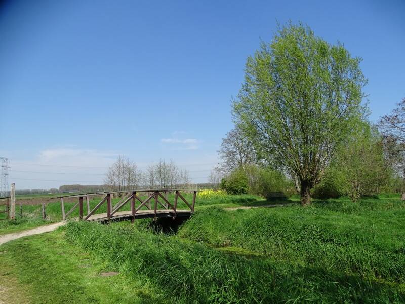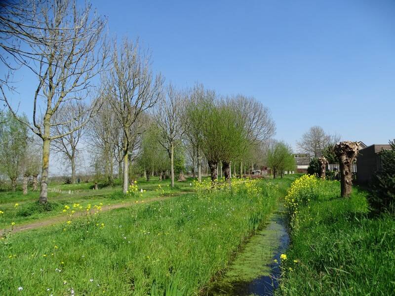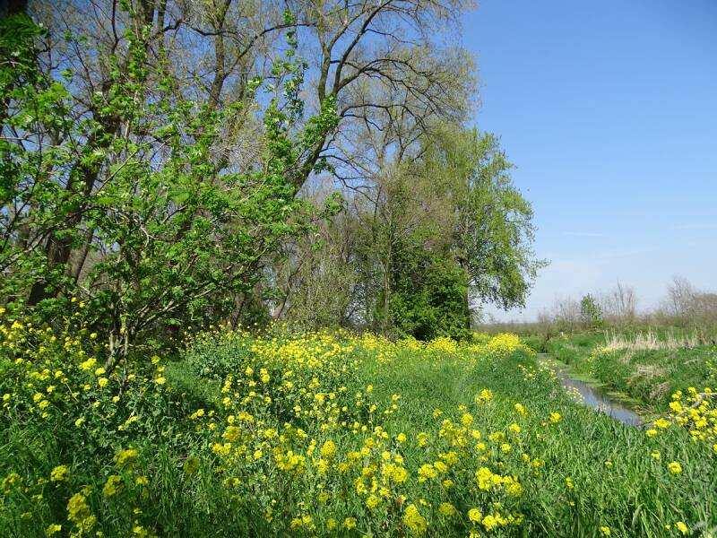 Foto onder: De bermen langs de dongedijk kleuren geel van het bloeiend raapzaad.