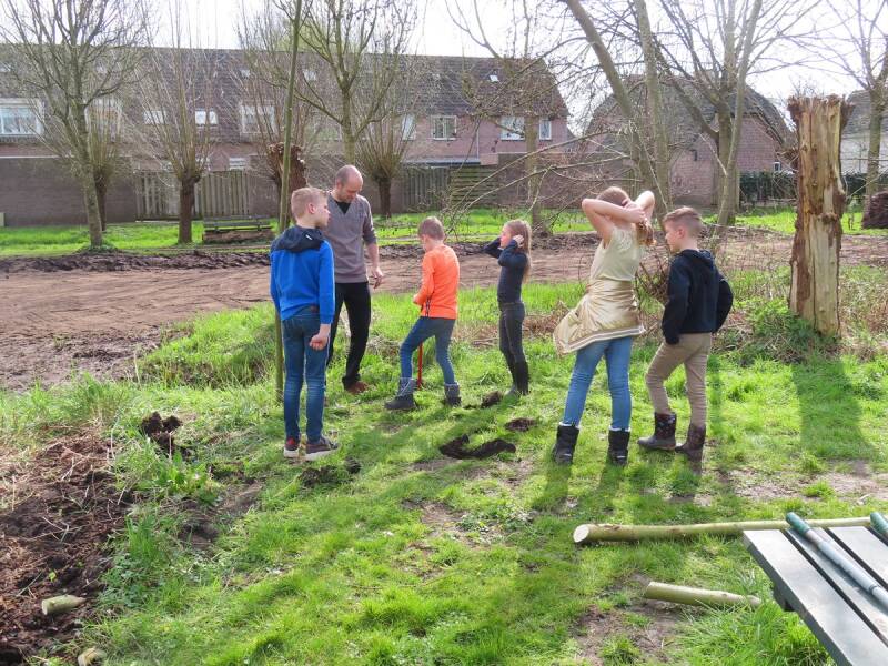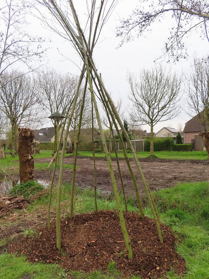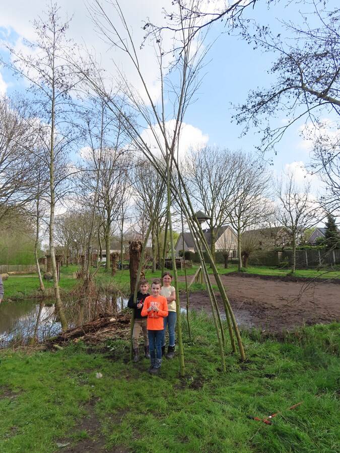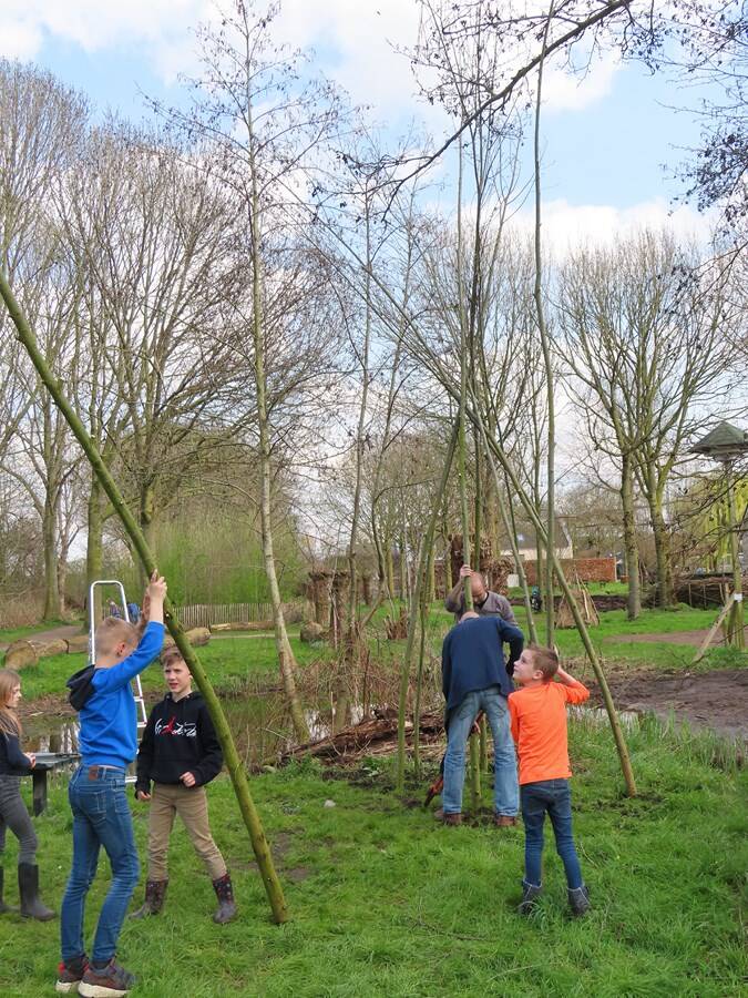 Foto's onder: Leerlingen bouwen wigwam van wilgentakken