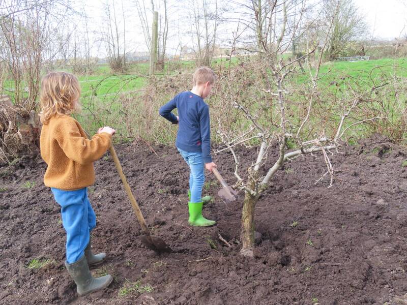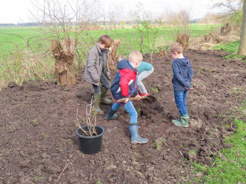 Foto's onder: Leerlingen planten de eerste bomen in het mini voedselbos