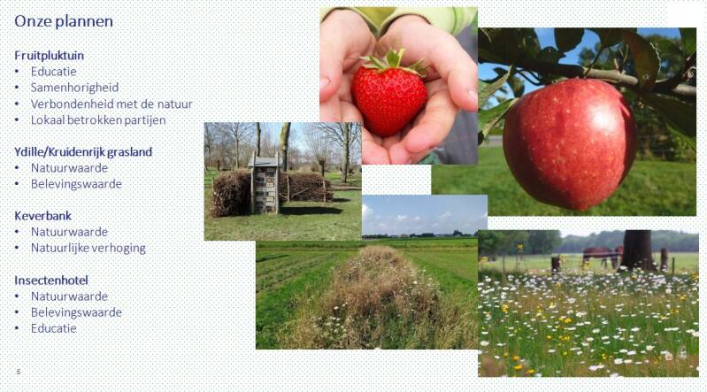 De Idylle, (de bloemenweide met meerjarige planten), wordt opnieuw aangelegd. Ook wordt de bloemenweide voor eenjarige bloemen opnieuw ingezaaid. De poelen zijn dit jaar al uitgebaggerd met subsidie van Brabants Landschap en met een bijdrage van de gemeente Dongen. Tijdens één van de natuurlessen zijn de schoolkinderen van basisschool “De Wegwijzer” betrokken bij het schonen bij één van de poelen. Onder toeziend oog van de kinderen zijn de werkzaamheden uitgevoerd. Lees meer. Er wordt een keverbank gemaakt en er komt ook een pluktuin met fruitbomen en bessenstruiken waar iedereen van mag plukken. Speciale aandacht is er voor de uilen in het gebied. Er wordt een steenuilenkast gehangen en door het planten van wintergroene bomen, wordt een ransuilenroestplaats gecreëerd. Tevens wordt een pleegtuin aangelegd. Takkenrillen en het insectenhotel worden opgeknapt. Er wordt een bijenkast geplaatst en een speelhut van wilgentenen gemaakt. Voor de wandelende bezoekers van ’t Bieslant worden informatieborden geplaatst met info over het gebied en over wat er te zien en te doen is. Ook het buitenboek wordt vernieuwd en aangevuld. In dat boek staat o.a info wat voor bloemen, bomen, vogels, insecten en andere dieren er voor komen.